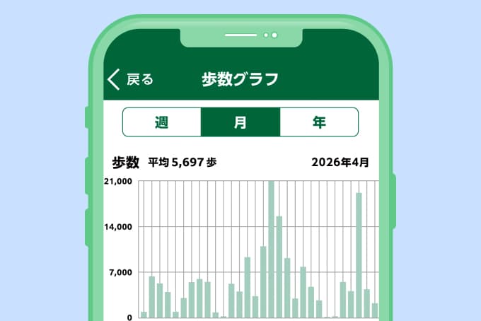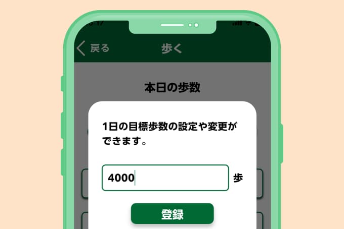 スタート今日の目標歩数を決めてスタートすると、アクティブな1日がさらに楽しく。達成するとポイントもたまりお得感もUP。